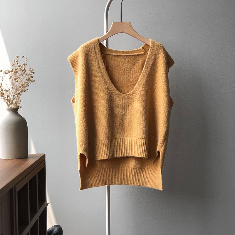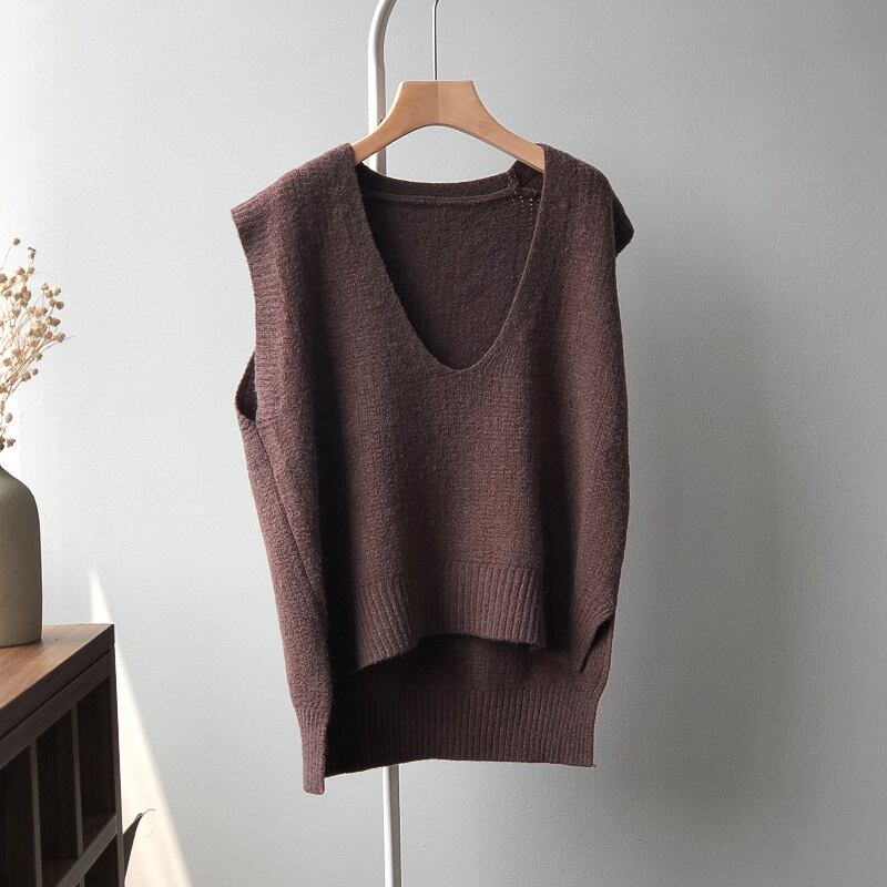 送料無料 ニットベスト レディース 大きいサイズ Vネック ノースリーブ ロングセーター ニット レディース トップス 前後丈違い サイドスリット 無地 グレー ブラック ブラウン オフホワイト イエロー ワンサイズ