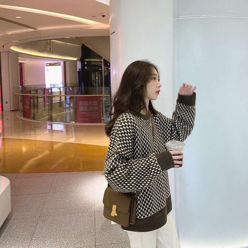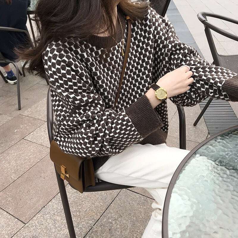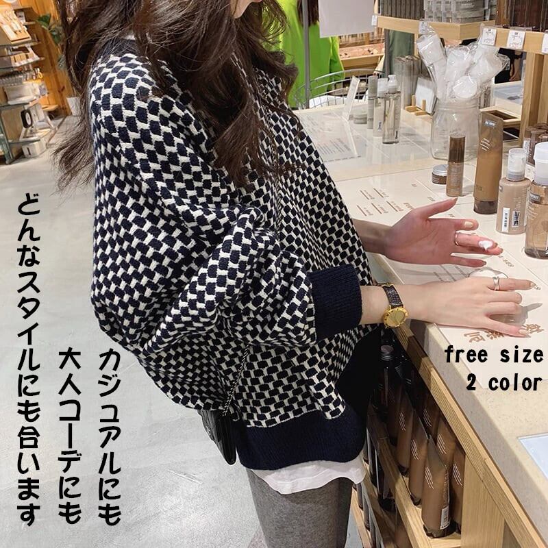 送料無料 レディース 大きいサイズ トップス ニット オーバーサイズ ゆったり 長袖 レトロ ジャガード柄 厚手ニット 切り替えデザイン ブラック ブラウン 秋 冬